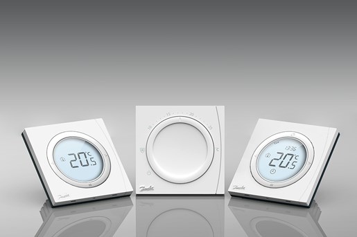 The basic solution for controlling a system is to use a room thermostat, designed for the relatively slow response times in floor heating or cooling. The room thermostat controls a thermal actuator which allows more or less heated or cooled water into the system. In most cases, the thermostat is mounted in the living room.